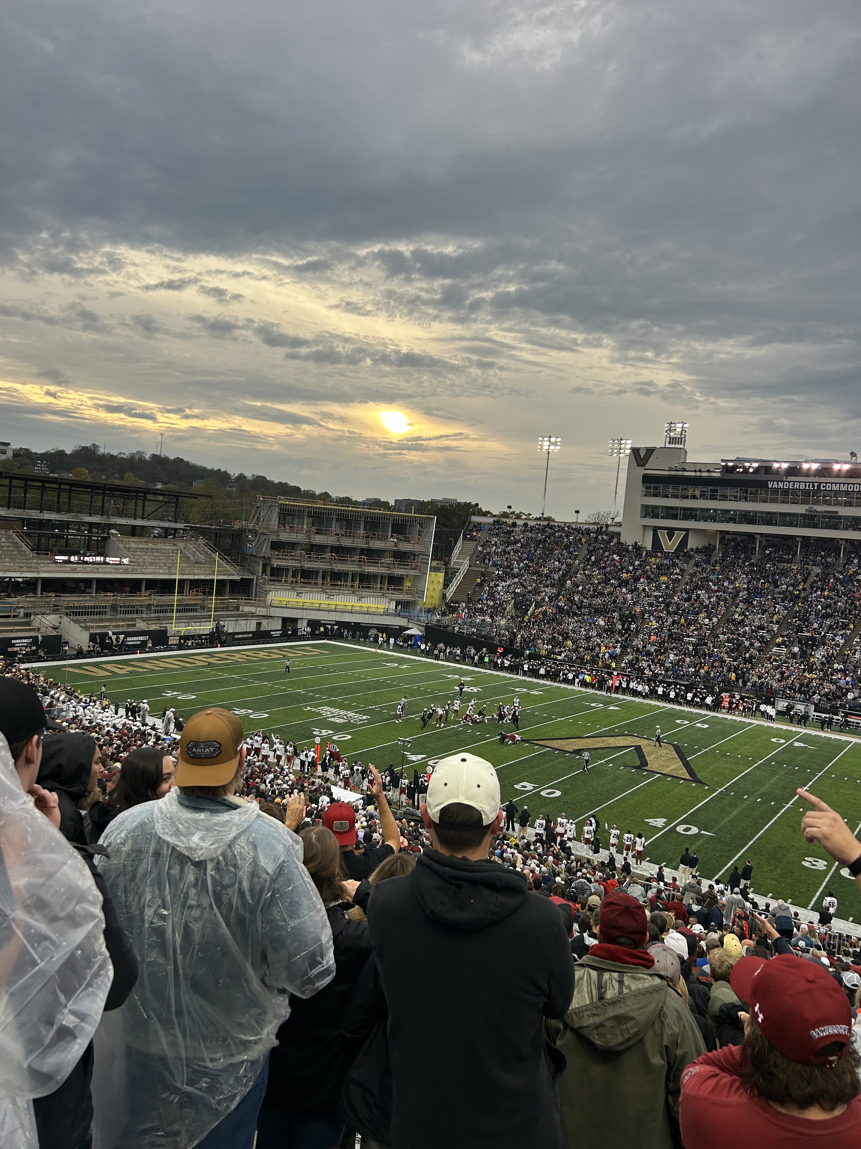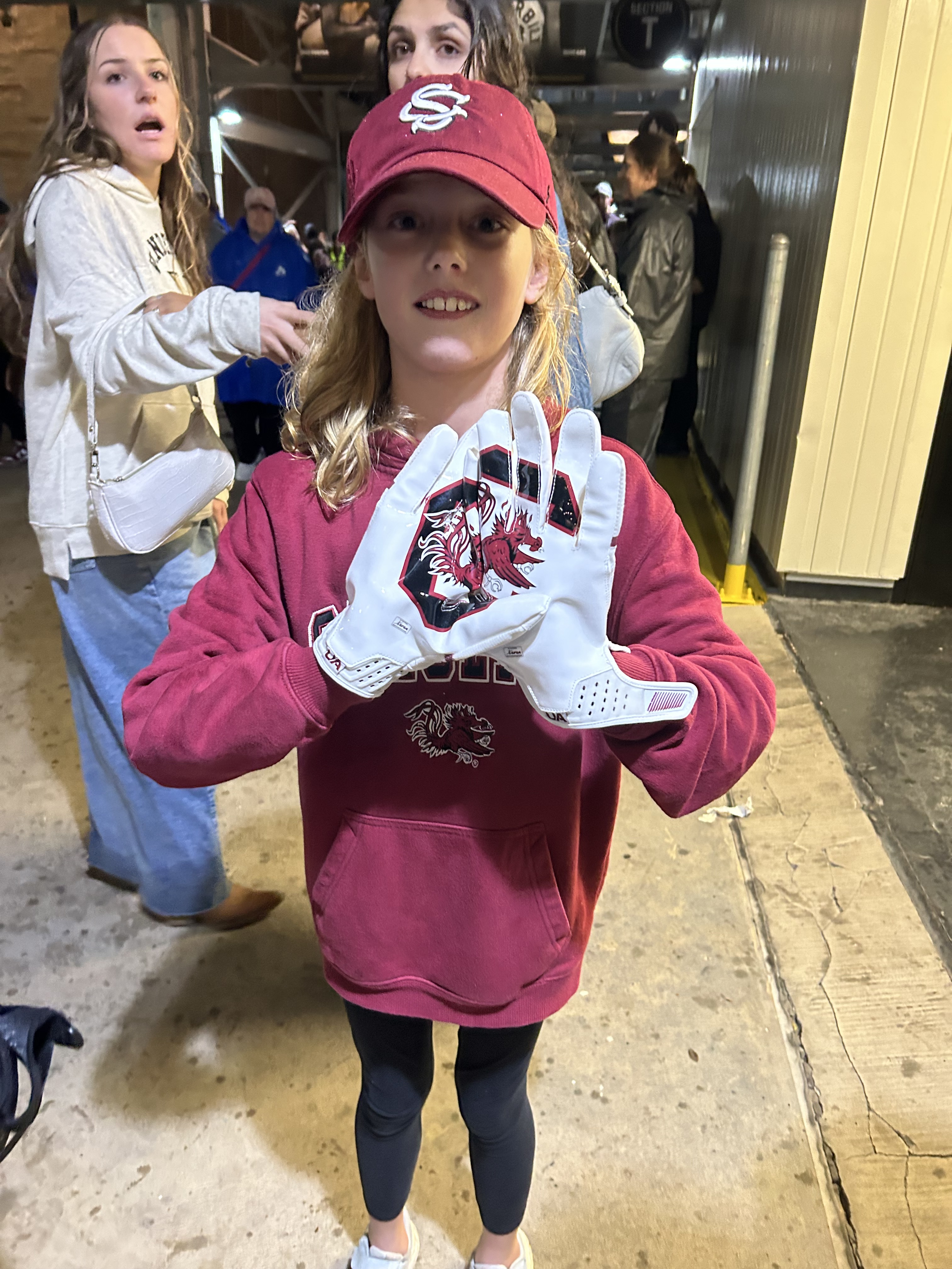 After the playground, we went home and got ready for the game. We grabbed a quick bite to eat at The Grilled Cheeserie (connected to Biscuit Love and oh so good!) As predicted, the rain came. Thankfully, it was not too cold, it was not a tremendous downpour, and we had prepared enough to have the proper gear for the weather. To also make a game like that better, we were winning and we were doing really well, when there seems to always be a chance we would go in there and get crushed (isn’t that the Gamecock curse?!) One benefit of an away game is that you are clearly outnumbered by the other fans and when they started losing, many of them left. This left us with the opportunity to walk all the way down in the stands and watch the end of the game from the very front. Laurence and Louise were in hog heaven, shouting to the players and even scoring a pair of gloves from one and an arm band from another. This would not be possible at Williams Brice, so it was special seeing how excited they were to get so close to their beloved Gamecocks.